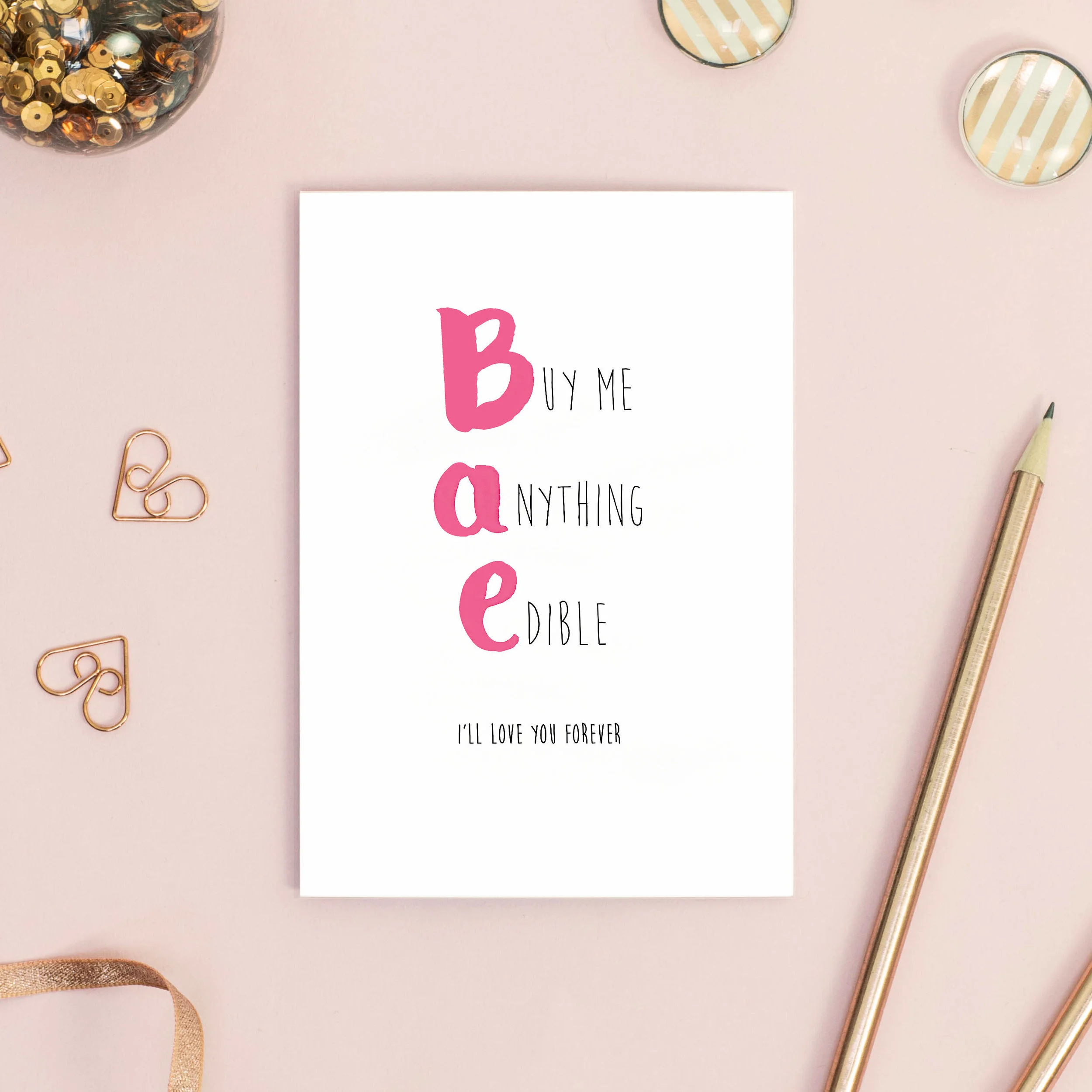 Cards BAE | Buy me Anything Edible Previous30th Birthday Card | The Big 3-Oh NextYou're One in a Million BAE | Buy me Anything Edible BAE | Buy me Anything Edible £2.50 A6 hand-lettered design printed on white linen cardstock with kraft envelope.Blank inside.All rights reservedCopyright © 2016 oopsadoodle Sold Out Add To Cart Facebook0 Twitter